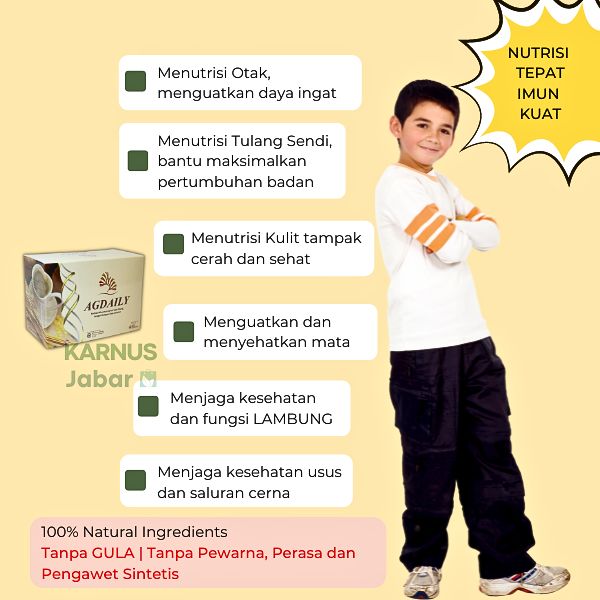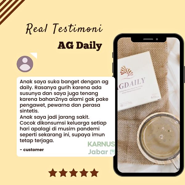 Ag daily dapat menjadi solusi sarapan sehat penuh manfaat untuk seluruh anggota keluarga. Kandungan bahan alami pilihan dalam AG Daily dapat membantu memenuhi kebutuhan nutrisi harian tubuh yang mudah diserap hingga tingkat sel sehingga tubuh lebih sehat, kuat, memperkuat daya ingat dan kefokusan serta meningkatkan imunitas.