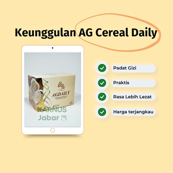 AGDAILY adalah serbuk minuman sereal dan pisang dengan rasa cokelat kolagen yang didasarkan pada Konsep Karnus. Dirumuskan dari bahan-bahan alami pilihan dan melalui proses khusus untuk menjaga nilai gizi dan manfaatnya, AGDAILY mengandung tepung pisang, susu bubuk full cream, bekatul beras, oat, kolagen sapi, kakao bubuk, gelatin sapi, dan ganggang laut. Tanpa bahan tambahan pangan sintetik, produk ini aman dikonsumsi dalam jangka panjang, cocok untuk segala usia mulai dari anak-anak usia 5 tahun hingga orang dewasa dan lansia. Perbedaan utama AGDAILY dengan AG Cereal Reguler adalah teksturnya yang lebih halus dan kandungan susu bubuk full cream yang memberikan rasa yang lebih gurih dan nikmat. Produk ini telah mendapatkan izin edar dari BPOM MD dengan nomor registrasi 830537021020.