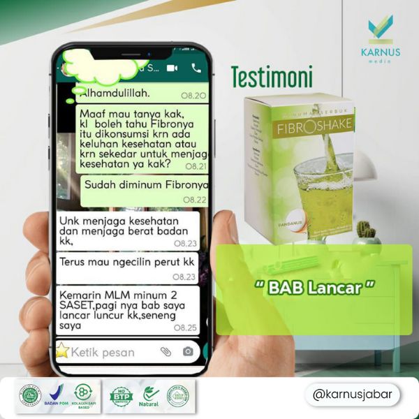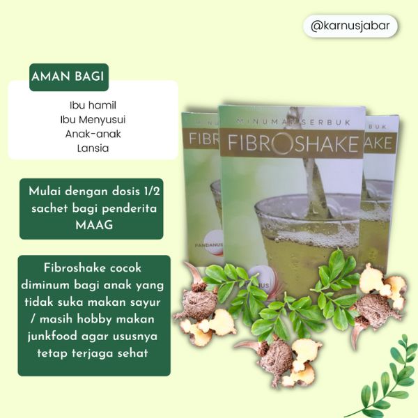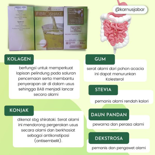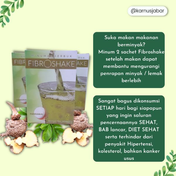 Fibroshake merupakan minuman serat alami dengan cita rasa pandan, mengandung kolagen halal, konjak, gum, stevia, dan dekstrosa, yang diformulasikan sesuai dengan Konsep Karnus.