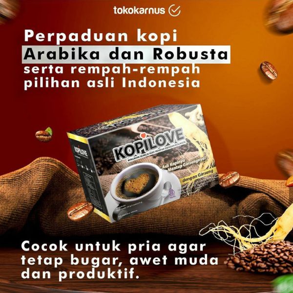 Kopi Love menghadirkan paduan kopi arabika dan robusta, dicampur dengan rempah-rempah pilihan asli Indonesia, menghasilkan aroma dan cita rasa yang khas serta unik yang diformulasi sesuai KONSEP KARNUS sehingga memberikan beragam manfaat. Setelah mengonsumsi Kopi Love, Anda dapat merasakan manfaat seperti meningkatkan kehangatan tubuh dan stamina, memberikan rasa kenyamanan melalui aromanya, serta memberikan kebugaran tanpa efek samping. Dirancang khusus untuk kaum pria yang ingin tetap bugar, awet muda, dan produktif, Kopi Love juga merangsang ide-ide kreatif dan semangat baru setiap harinya. Kelebihan lainnya, kandungan kolagen dalam Kopi Love dapat meningkatkan keperkasaan pria secara alami tanpa efek samping. Kopi Love, memang Pria Punya! Produk ini telah terdaftar dan mendapatkan izin dari BPOM MD dengan nomor 867037007020.